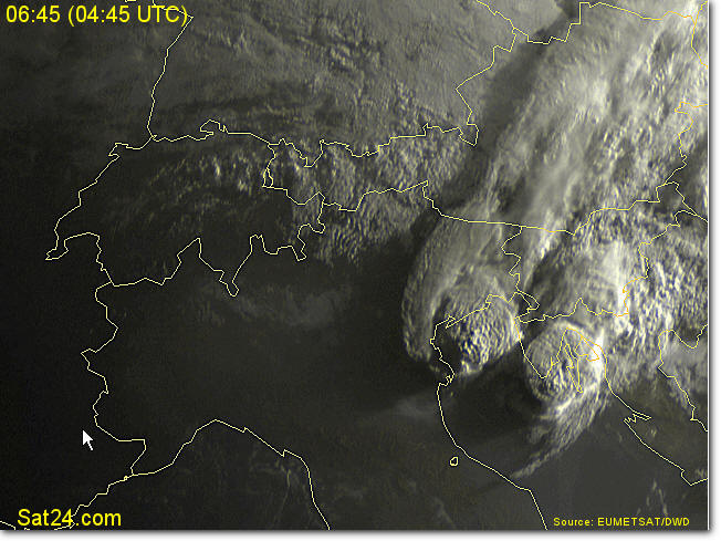 Das Teil zog dann nach Südosten ab - doch es bildeten sich die ganze Nacht durch immer wieder neue Schauerzellen in diesem Bereich. Heute früh nun liegt die gewitterträchtige Zone bereits über der Adria.