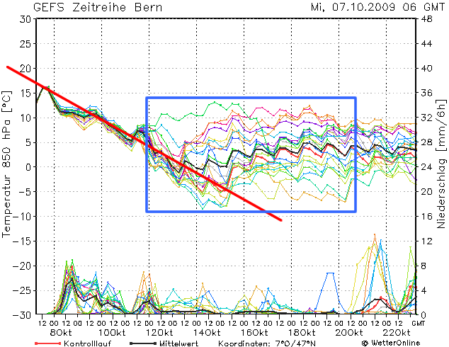 Die abfallende Linie könnte kaum "schräger" sein - einzige Hoffnung: Die Streuung der Läufe im blauen Bereich.