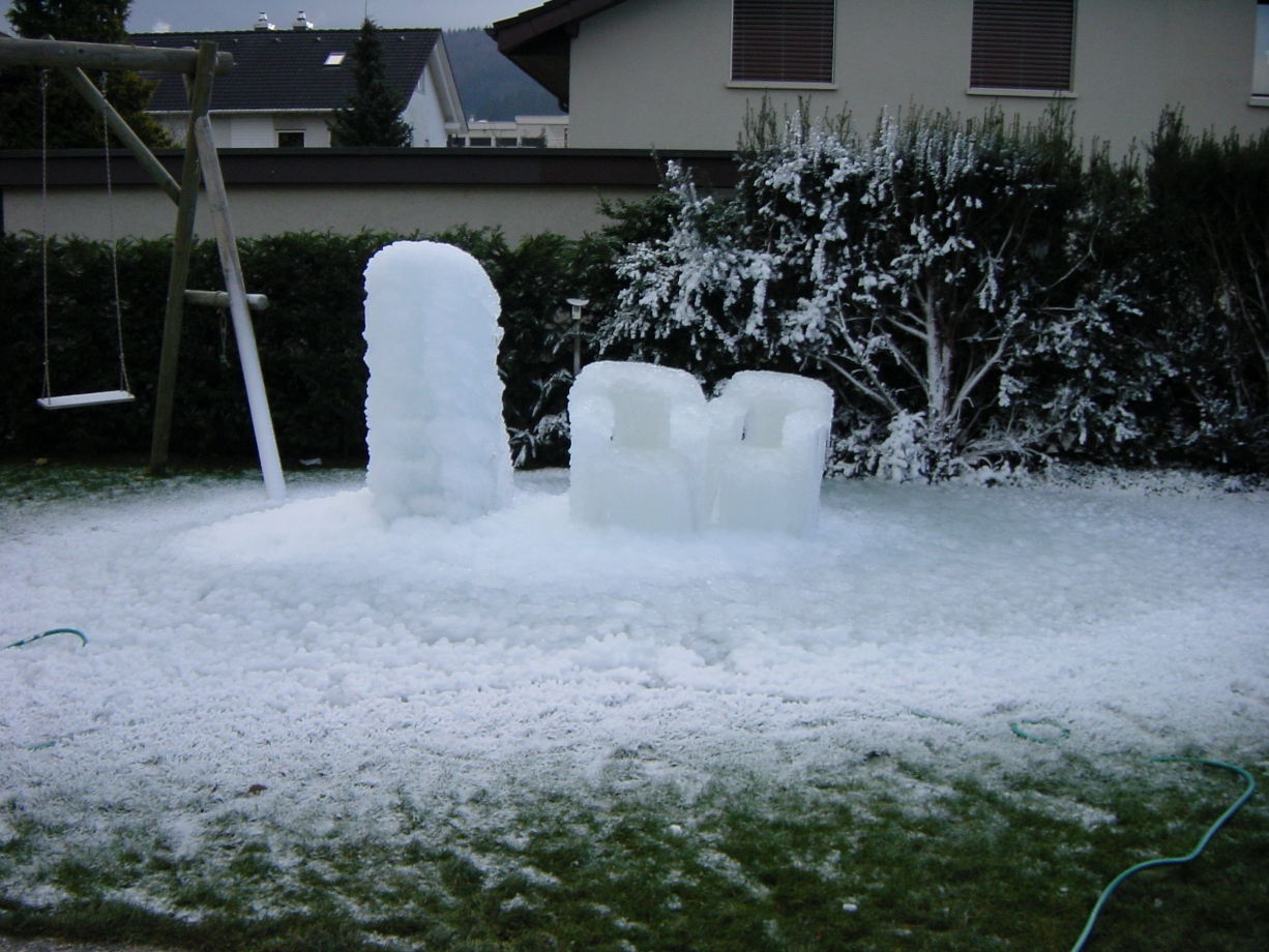 Was einem bei Kahlfrost so alles einfällt. Hier ein Bild aus meinem Garten vom 16.12.01. Ein Gartenschlauch der einen feinen Wasserstrahl verspritzt über 48h...