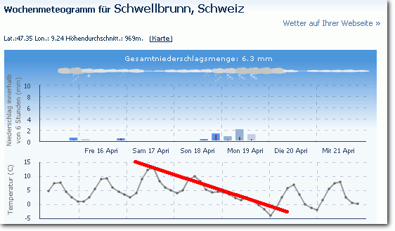 Hier ist es auch recht kalt (7-8°). Über den Himmel ziehen Kaltluftwolken wie im Januar, zum Glück ist es trocken. Ich muss sagen, ich bin nicht begeistert. Ein Frühsommerhoch mit konstanter Südostströmung wie 2003, 2007, 2009 will sich nicht einstellen und ist nicht in Sicht. Nicht einmal eine konstante südliche Westlage wie 2005 oder 2008. Die Prognosen für nächstes Wochenende machen allerdings etwas Hoffnung auf jahreszeitengemäße Werte. Nach aktueller Kartenlage wären hier 15-20° drin, sofern sich der Regen in Grenzen hält, wie GFS es zeigt. EC allerdings rechnet mit Schauern, welche zwar vermutlich nur auf dem Radar existieren würden, aber die Temperatur dämpfen. Das elende Wintermuster will und will nicht verschwinden, dabei wäre gerade für die Landwirtschaft eine längerandauernde Westlage wichtig. So wie jetzt gibt es entweder Trockenheit und normale Temperaturen (wie letzte Woche), oder aber starke Kälte und Niederschlag. Keines von beiden treibt die Blüte voran. Wenn ich mich an 2008 erinnere, damals waren Anfang April schon die meisten Baumblüten verblüht und am 11.4. hatten wir 20°, letztes Jahr 24° und 2007 waren es 19°... Die Natur hat einen regelrechten Rückstand, auch vom harten Winter. Jedenfalls werde ich die nächste Gelegenheit für einen Mittelmeer- und/oder Italienurlaub nutzen
