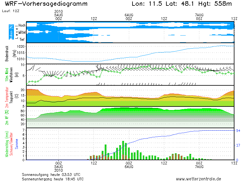 Am späteren Abend kann es in den Alpen, am Alpensüdhang sowie in Juranähe bereits einzelne Platzregen oder Gewitter geben. In der zweiten Nachthälfte zieht die Kalfront zur Schweiz und bringt verbreitet Regen. Im Einflussbereich des Höhentroges wird die feuchte Luftmasse zusätzlich angehoben und es kommt zu kräftigem Regen, teils auch mit Gewittern.