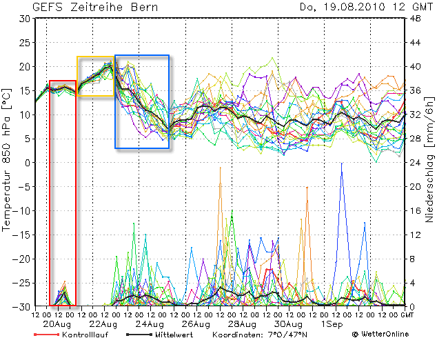 Waren es letzten Sonntag noch richtig tolle Prognosen: Dienstag Übergangstag dann sonnig und immer wärmer, neue Wolken erst ab kommendem Dienstag - so sind es jetzt quasi nur noch Samstag und Sonntag. Und auch hier gibt es schon Ausnahmen: Der Sonntag ist im Westen bereits gewitterhaft... Montag ein "Übergangstag", bevor es ab Dienstag bergab geht (blau).