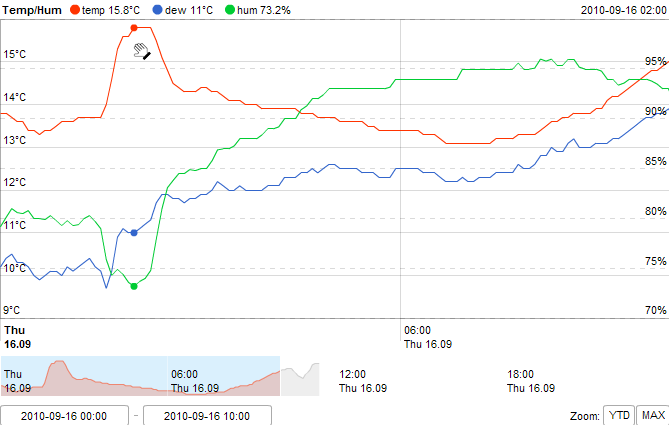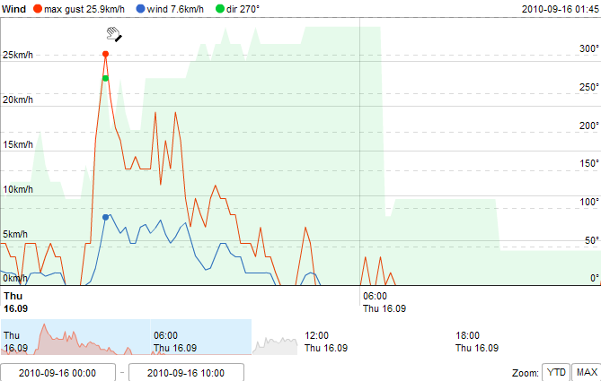 Seit ich meine geliebte Davis habe, finde ich immer wieder mal interessante Wetterphänomene. Das Gute an der weatherBoxx bzw. an allen Datenloggern ist, dass ich nachts schlafen kann wie ein Stock, nichts mitkriege und dann am Morgen erstaunt feststelle, dass zwischen 01:30 und etwa 02:15 Uhr kurz der Westföhn durchgebrochen war.
