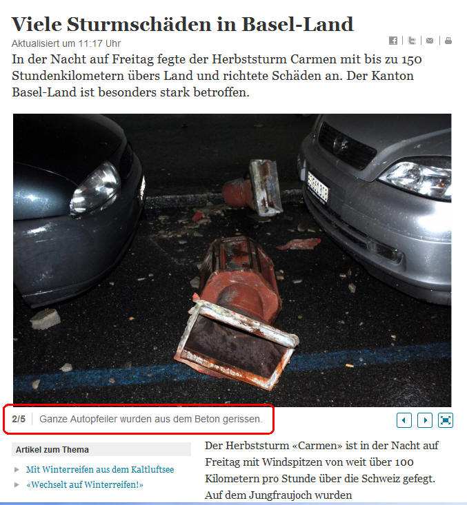 Das sieht man also ein Bild, etwas liegt zwischen 2 Autos am Boden und schon wurden "Autopfeiler aus dem Beton gerissen". Da frag ich mich schon, wie naiv man eigentlich sein muss. Bevor so etwas aus dem Beton gerissen würde, wären die Autos längst davongeflogen. Das Teil auf dem Bild ist eine Kamin- oder Abluftabdeckung - von einem Hausdach abgerissen und heruntergeweht.
