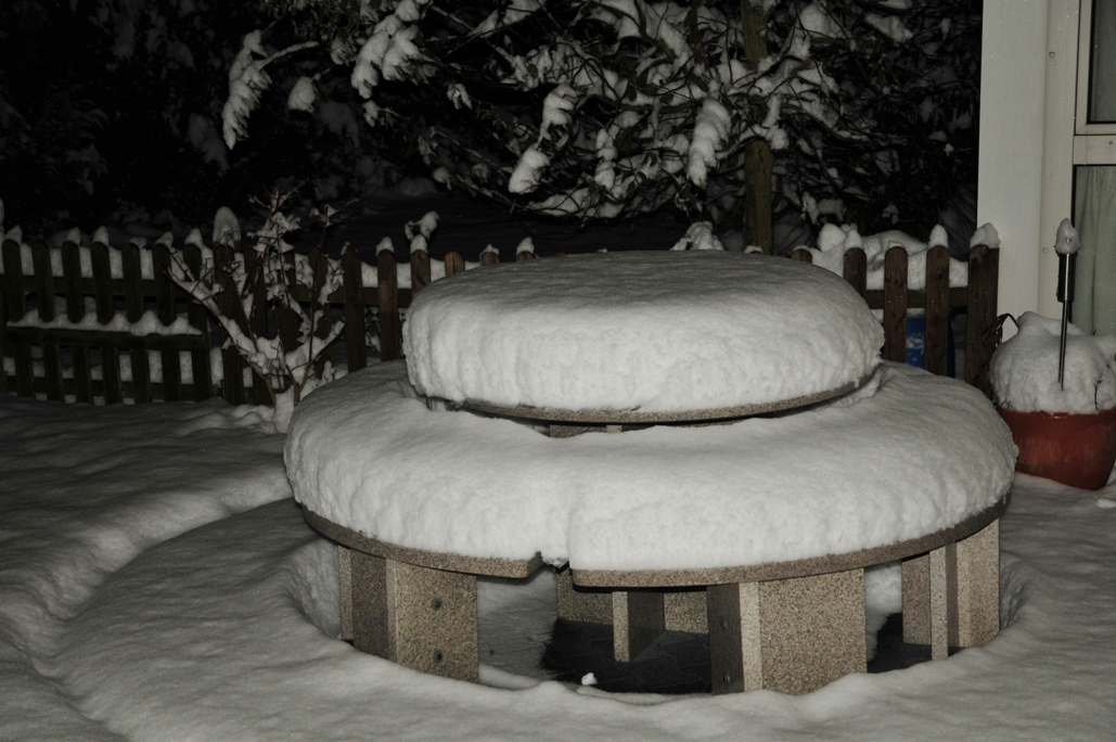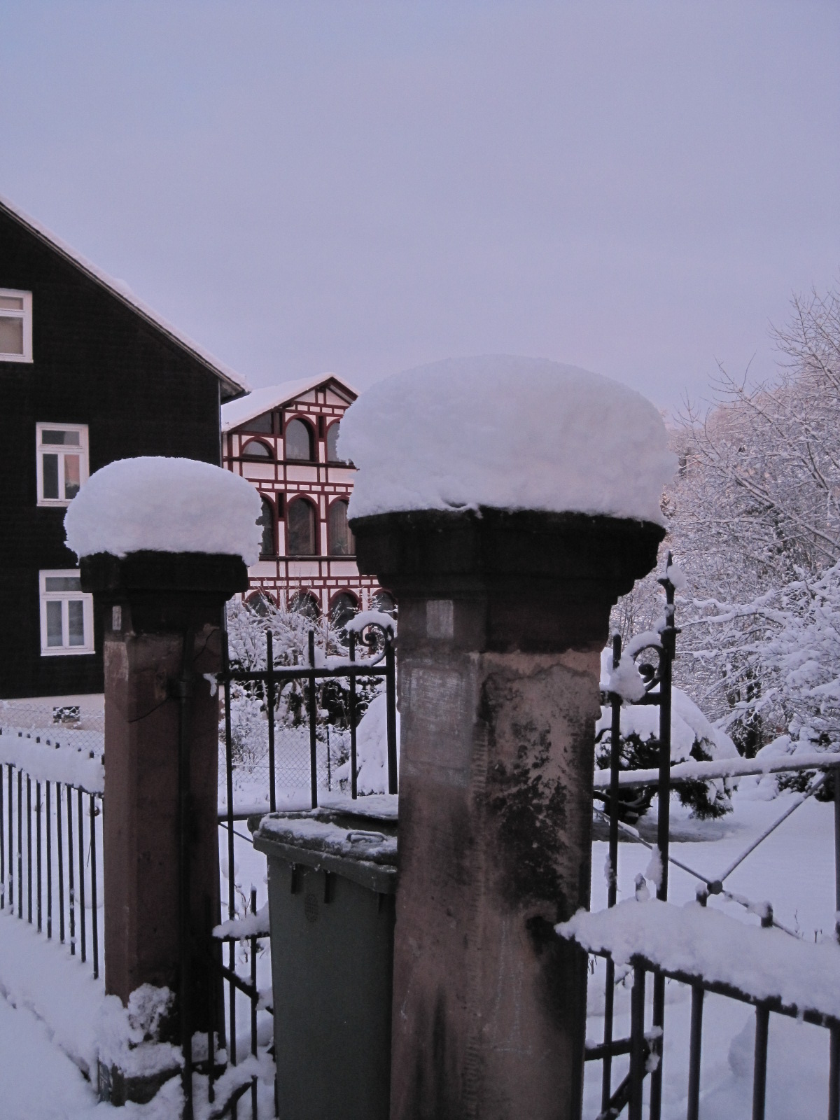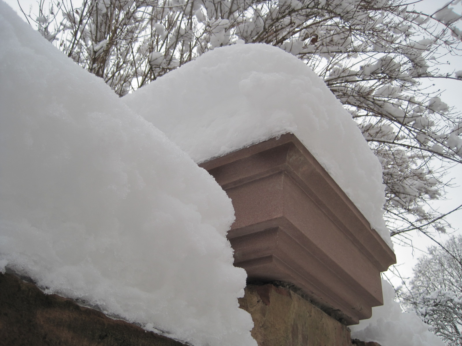 In der Nacht von Donnerstag auf Freitag fielen satte 17 Zentimeter Neuschnee. Gestern früh lagen hier rund 30 Zentimeter der weißen Pracht. Es war einfach ein traumhafter Anblick. Ich mußte sogar unser Garagendacht von der schweren Last befreien.