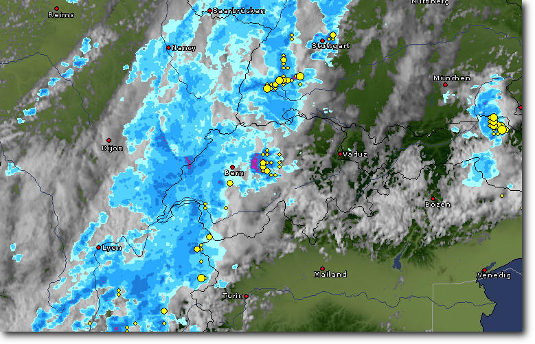 Ein kräftiges Teil ist ostlich von Bern in der Zentralschweiz und zieht Ost-Nordostwärts. Es fragt sich, wie lange es durchhält (Verstärkung? Abschwächung?).