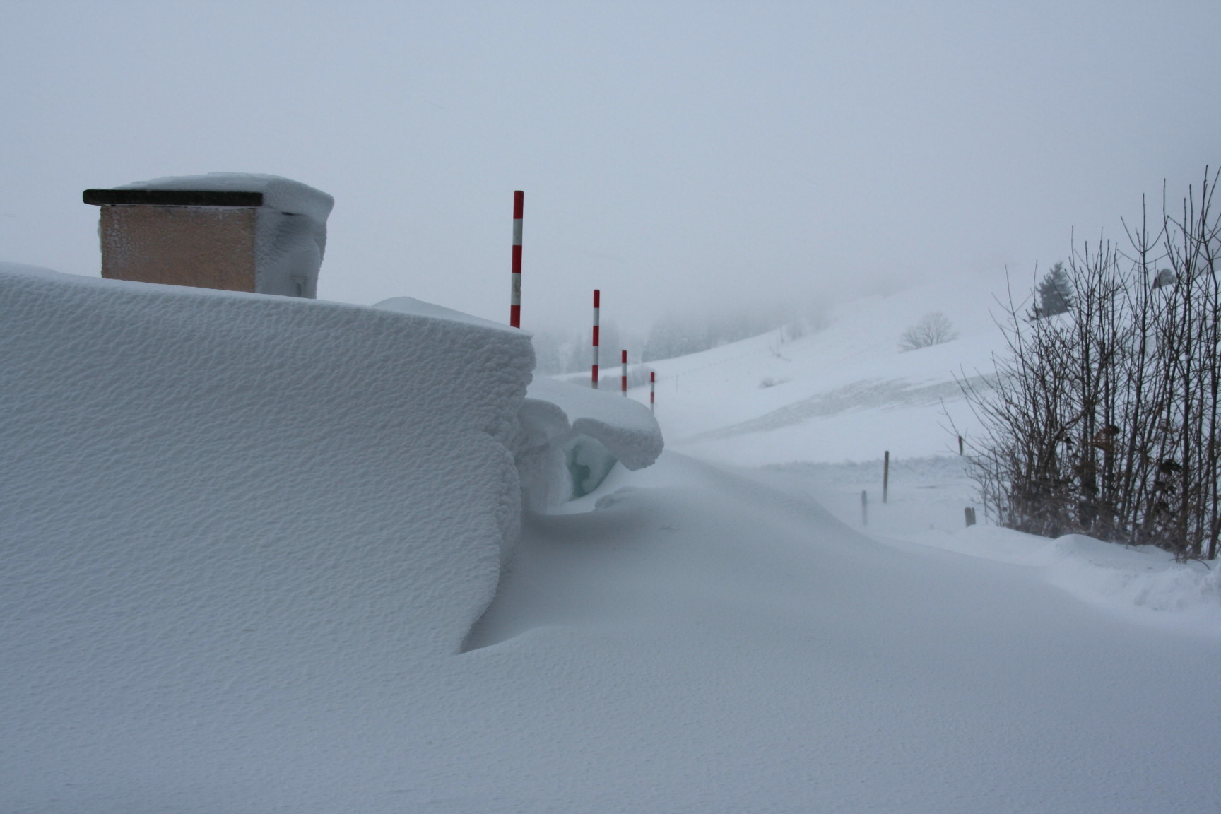 Heute hats leicht geschneit - aber viel gewindet. Bis Montagmittag sollen hier 40cm dazukommen. Ich glaube aber noch nicht dran. Insbesondere könnte mir dann unter Umständen das Schneefräsenbenzin ausgehen....