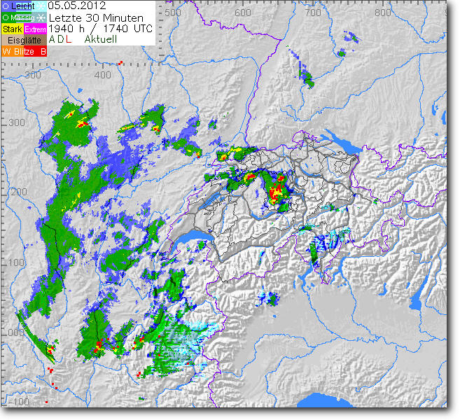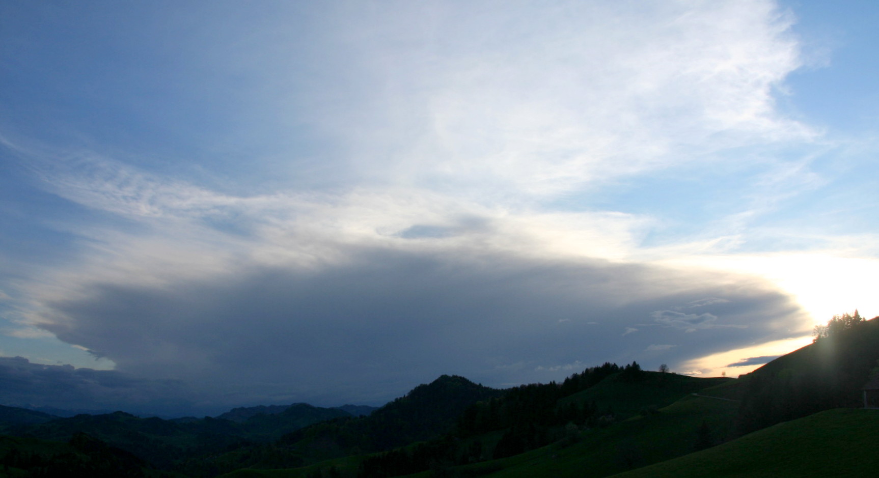 Bei uns hat ab 19:45 Uhr immer mehr geblitzt, die Blitzrate stieg auf bis zu 1 Blitz pro 5 Sekunden hoch. Entsprechend war es teils ein Dauergrollen. Zuerst dachte ich es zieht wie so oft nur über Muri hinweg, in diese Richtung (ca. 10 km entfernt) waren gewaltige Blitze und Fallstreifen von mehreren km Durchmesser zu sehen. Diese Zelle zog dann tatsächlich über Muri hinweg, wir bekame nichts von dieser ab.