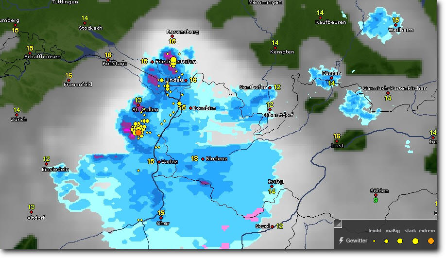 Aber wie das Teil auf die Hügelkette des Appenzellerlandes und das Alpsteinmassiv trifft, schwächt es sich zum Glück massiv ab. Es teilte sich sogar: Ein Teil eher den Alpen entlang, der andere Teil reaktivierte sich im Thurgau. Weiter Richtung Innerschweiz wars dann "nur" noch Regen.