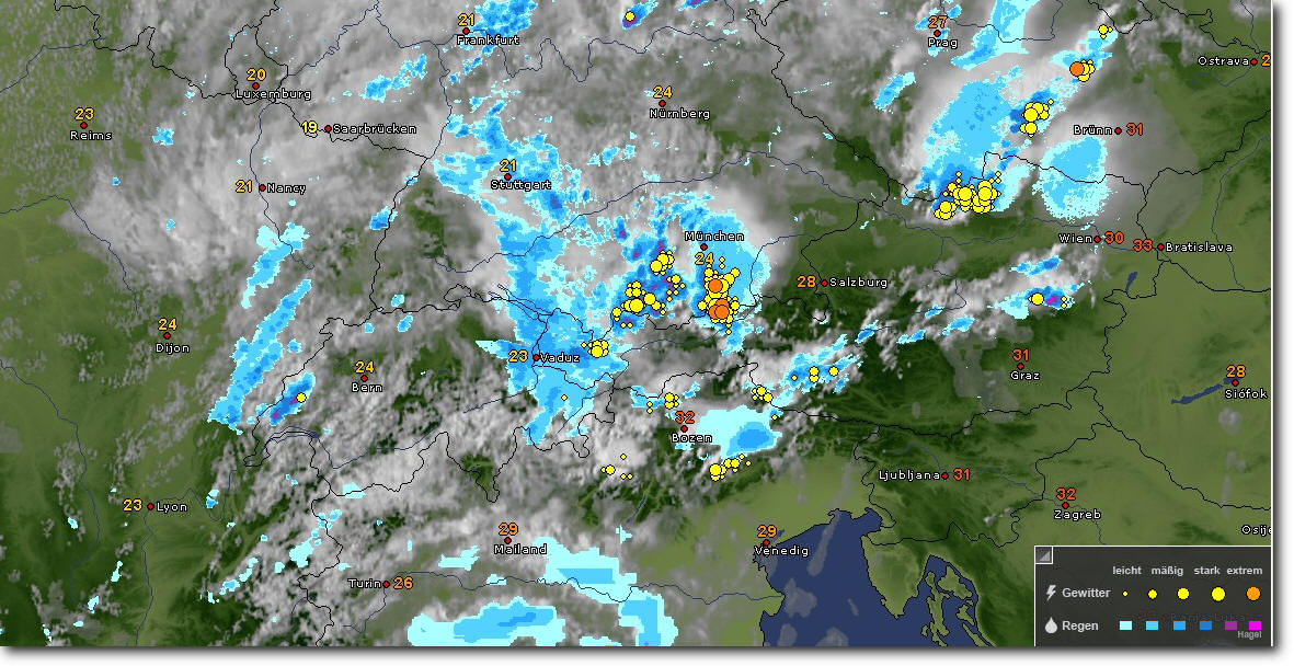 Die Gewitterstrasse erkennt man auch heute - mit einem kleinen "Unterbruch" von Salzburg bis Linz.