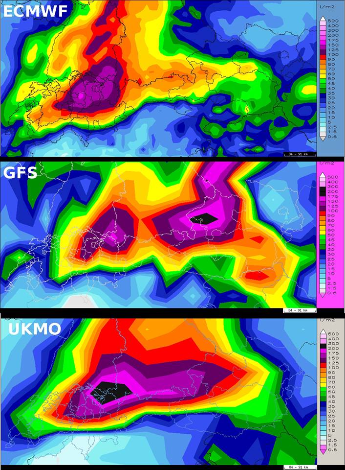Eine potentiell gefährliche Hochwasserlage bahnt sich für die Alpennordseite an - anbei die verschiedenen Modellregensummen bis Sonntag 06 UTC (08 MESZ). Der Schwerpunkt der Niederschläge wird von der Zentralschweiz über das bayerische Alpenvorland bis ins österreichische Salzkammergut gerechnet. Aber auch in den Regionen, wo weniger Regen fällt, ist entlang der entwässernden Flüsse Hochwasser möglich.