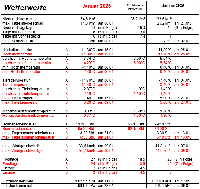 Mit einem Temperaturdefizit von 1,5°C war der 22,1 l/m² zu niederschlagsarme erste Monat des Jahres der kälteste Januar der letzten 9 Jahre und mit einem Sonnenscheinüberschuss von 49 Std. der drittsonnigste Januar seit Messbeginn 1966.