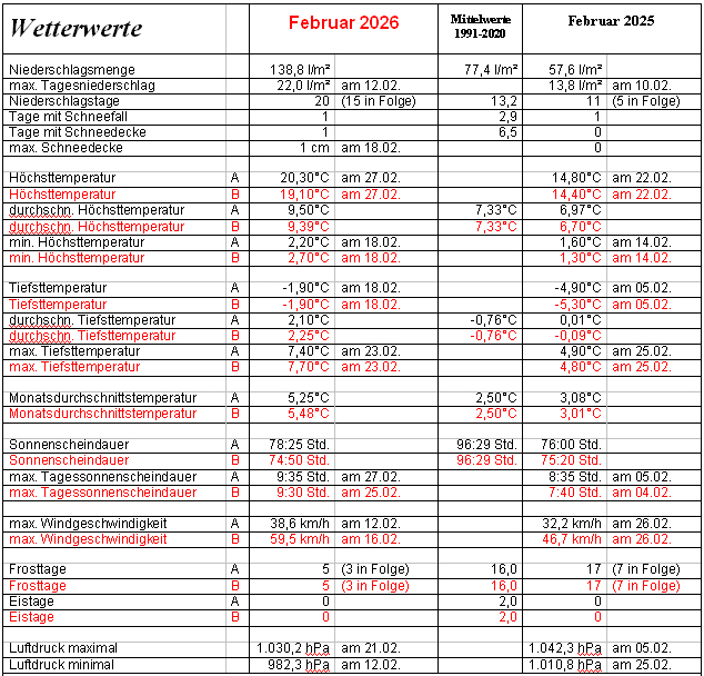Der 18 Stunden zu sonnenscheinarme und 2,8°C zu warme Februar war mit einem Niederschlagsüberschuss von 61,4 l/m² der niederschlagsreichste Februar der letzten 25 Jahre.