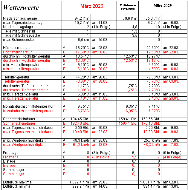 Nach 1 l/m² Regen in der Nacht zum 1. März gab es einen fulminanten Start in den ersten Frühlingsmonat. Eine Hochdruckbrücke mit den Hochs „Iackl“ und „Jannis“ sorgte mit viel Sonnenschein für ein für die Jahreszeit weit überdurchschnittliches Temperaturniveau. In den sternenklaren Nächten sank die Temperatur jedoch mit leichtem Bodenfrost bis auf den Gefrierpunkt. Ab dem 4. gesellte sich sogar noch Saharastaub hinzu, was den Himmel zum Teil etwas „milchig“ erscheinen lies. Nachdem in der ersten sehr sonnigen und 2,2°C zu warmen Dekade gerade einmal 1 l/m² Regen fiel, stellte sich die Wetterlage am 11. mit Tief „Fritaun“ um. Am 11. und 12. März fielen 16,6 l/m² Regen und am 14. kam es mit länger anhaltendem Regen zu einem Temperatursturz. So sank die Temperatur von Mitternacht bis zum Nachmittag von 10°C auf 2,2°C ab. Somit war die erste Märzhalbzeit 1,2°C zu warm, mit 36,8 l/m² fiel 46% des normalen Märzniederschlages und die Sonne schien an 106,5 Std. schon 67% des Solls. Zum Start in die zweite Märzhälfte kehrte das Frühlingswetter zurück, wobei in der sternenklaren Nacht auf den 16. die Temperatur auf minus 1,6°C sank. Die Hochs „Lukas“ und „Max“ sorgten bis zum 25. für freundliches und mildes Frühlingswetter. Bereits am 22. März wurde die normale März-Sonnenscheindauer übertroffen und bis auf 2 kurze Schauer am 22. und 23. mit insgesamt 1,2 l/m² Regen blieb es trocken. Auf den Bilderbuchfrühling folgte am 25. begleitet von Windböen um 60 kim/h ein Wintercomeback. Mit dem ersten Märzschneefall wurde die Landschaft am 25. leicht überzuckert und nach einer sternenklaren Nacht sank die Temperatur am Morgen des 28. mit minus 4,2°C auf die tiefste Temperatur des Monats, was die frühblühenden Obstbäume eiskalt erwischte. Bis zum Monatsende blieb es bei dem wechselhaften jedoch frostfreien April.